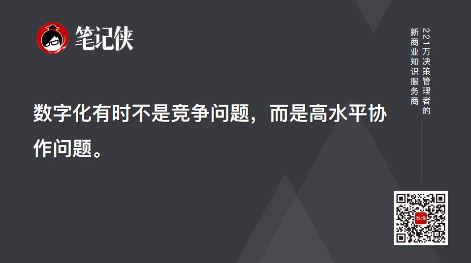 我们也可以看到,数字化转型,不只是一个企业自己的事。若你真想享受到数字化红利,应该是整个行业、整个产业都在推动转型,这是常说的“链”式转型,大家通过数字化的方式互相连接来共同提升生产效率,这时你才能享受到数字化最大的外部红利。
