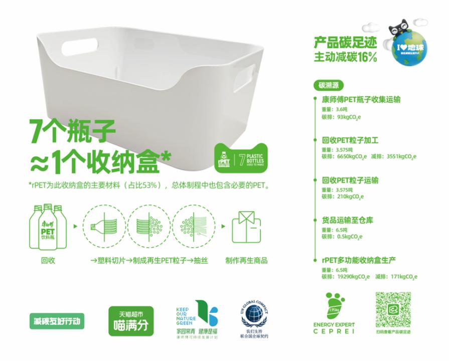 在“包装循环再利用”领域,阿里与康师傅率先从rPET(Recycled PET)场景寻求突破,用康师傅工厂提供的其生产PET饮料瓶时产生的废料,制成可循环再利用的rPET材料,最终加工成环境友好型商品,如服装、包袋、文具等。首批在淘宝88VIP频道上市的20000个rPET多功能收纳盒一经上市即被抢空。