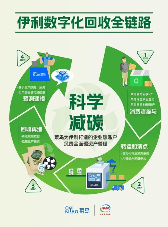 2022年,菜鸟与伊利合作开发了“全链路减碳数字化系统”,可记录商品在仓储、运输、驿站和消费者端的减碳数据,数字化衡量商品的碳排放表现,并提供各类优化碳排放量建议。在与消费者绿色互动上,覆盖全国300多个城市的超8万家菜鸟驿站和互动社区“菜鸟绿色家园”为伊利亿万消费者提供了线下线上可参与的绿色回收主阵地。