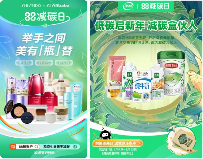 去年,阿里巴巴发布了“88碳账户”,成为国内第一个多场景、覆盖超10亿人的消费者碳账户体系,并接入菜鸟、闲鱼、饿了么、天猫等app的碳积分,在吃、穿、用等生活场景,激励消费者随手减碳。同时,阿里巴巴还与品牌联合发起了“88减碳日”活动,打造全新的低碳消费专属场景,提供便利的低碳消费选择。目前,阿里巴巴已经与资生堂就替换装消费、与伊利就低碳商品推广及空瓶奶盒回收分别开展了“88减碳日”活动。