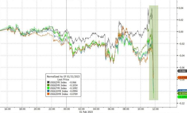 2月1日周三,美联储如期加息25个基点,为去年3月以来最小幅度,连续两次放慢加息步伐。鲍威尔称FOMC讨论“约加息两次后就暂停”,与会议声明措辞修改一道引发市场鸽派解读,风险资产狂欢转涨。美股尾盘转涨至日高,道指抹去逾500点跌幅,标普500指数涨1%至逾五个月最高,纳指涨2%至逾四个月最高,芯片股涨超5%至五个半月最高。美债收益率大幅跳水至两周新低,美元创九个月新低下逼101,黄金转涨超1%至九个月最高,离岸人民币涨超400点。美联储主席鲍威尔在记者会上说,通胀有所缓和但仍处于高位,但“现在第一次可以说,通货膨胀放缓进程已经开始。”鲍威尔强调,鉴于经济状况,预计今年不会降息。