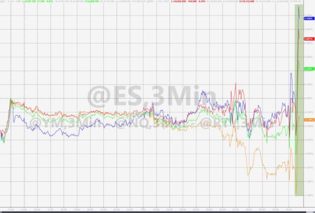 尾盘时美股集体转涨至日高,道指最高涨近250点或涨0.7%,此前一度跌超500点或跌超1.5%,短暂失守3.4万点整数位。标普500指数最高涨1.8%并升破4100点,此前跌1%且能源板块领跌。纳指最高涨2.8%,此前跌0.7%。罗素小盘股最高涨2.3%,此前跌0.5%。