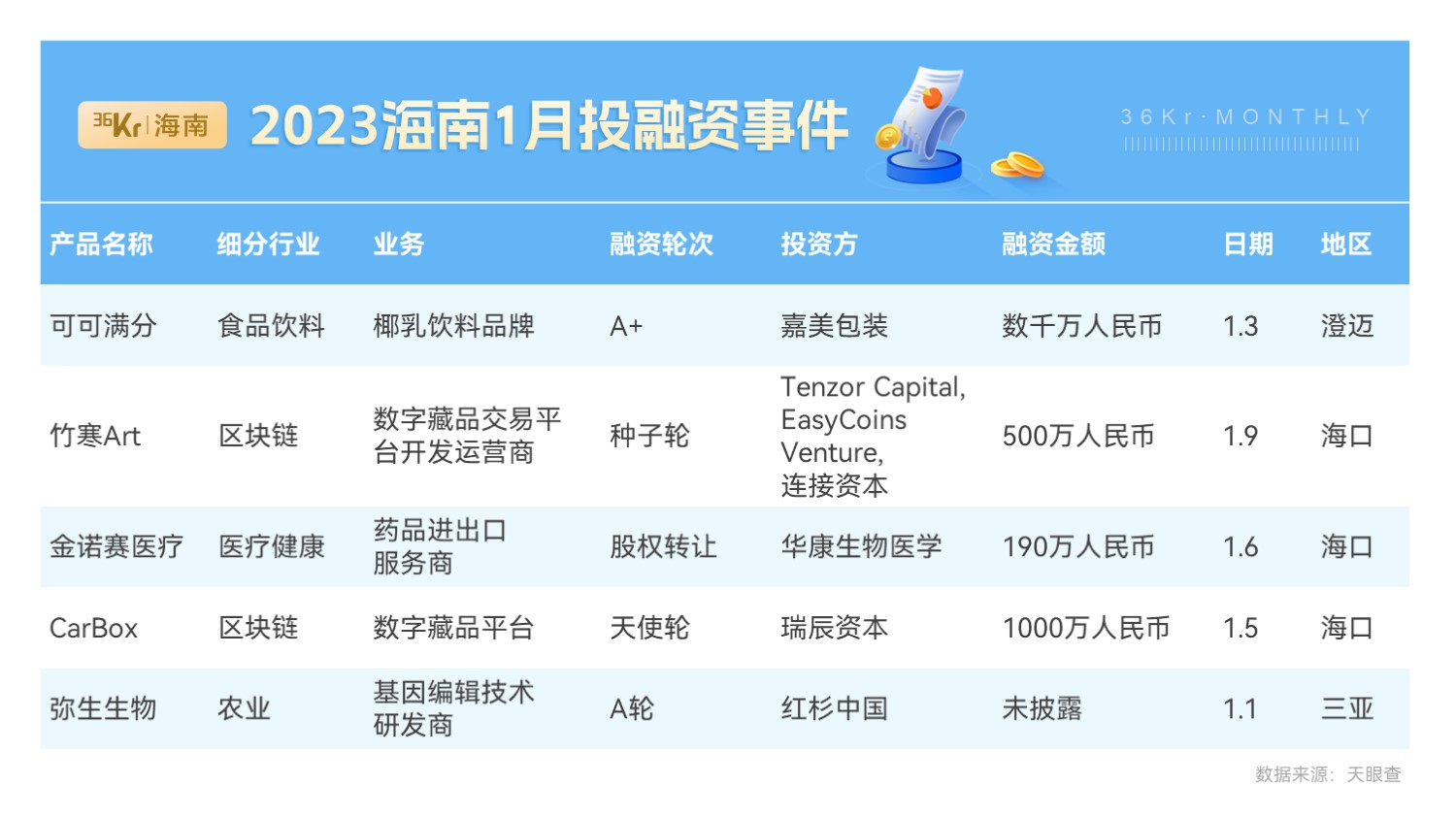 2023年1月,36氪海南对海南省内发生的投融资交易事件进行了盘点,以便海南新经济参与者了解各赛道发展趋势和投资关注点。