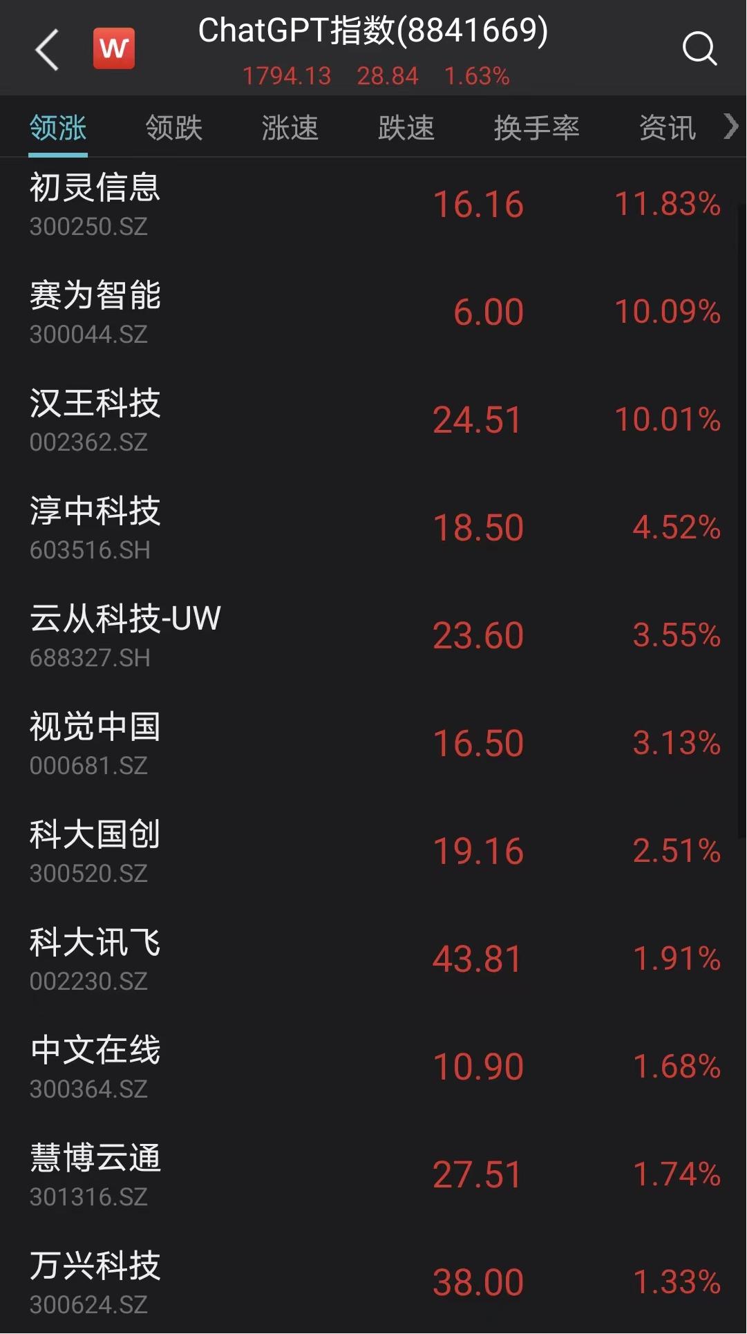 ChatGPT概念继续活跃,汉王科技4连板,初灵信息涨超12%,神思电子、云从科技、昆仑万维、科大讯飞等涨幅居前。消息面上,OpenAI周三宣布,推出其人工智能聊天机器人ChatGPT的付费订阅版本,新的订阅服务名为ChatGPT Plus,月费为20美元。