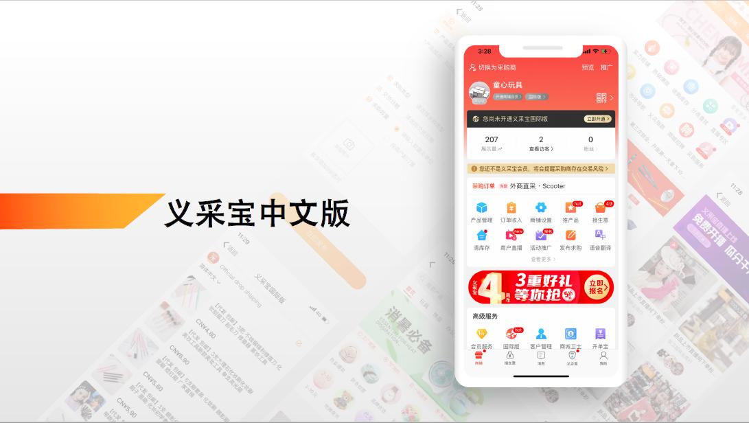 “义采宝”也是浙江中国⼩商品城官方应用,APP总下载量超过7000万,店铺开通数超过30万,撮合交易额累计达到220亿元,在线交易额突破20亿元。“义采宝”合作方包括义乌国际商贸城、西南国际商贸城、湖南怀化义乌小商品城、重庆万州友豪万商城等大型线下批发市场。在海外,“义采宝”国际版下载量突破80万,涵盖30万采购商。