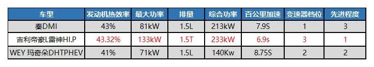 先来看发动机效率,我们以比亚迪秦DMI、吉利帝豪L雷神HI.P、WEY 玛奇朵DHTPHEV来做对比,这其中玛奇朵由于是SUV车型,加速和油耗有所吃亏,不过也具有一定的参考意义。