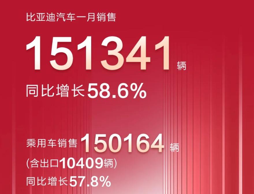 数据显示,今年1月份比亚迪销售了151341台新车,较去年同期大幅增长63%,较去年12月减少36%。其中乘用车销量为150164辆,同比增长57.8%,环比减少36%。