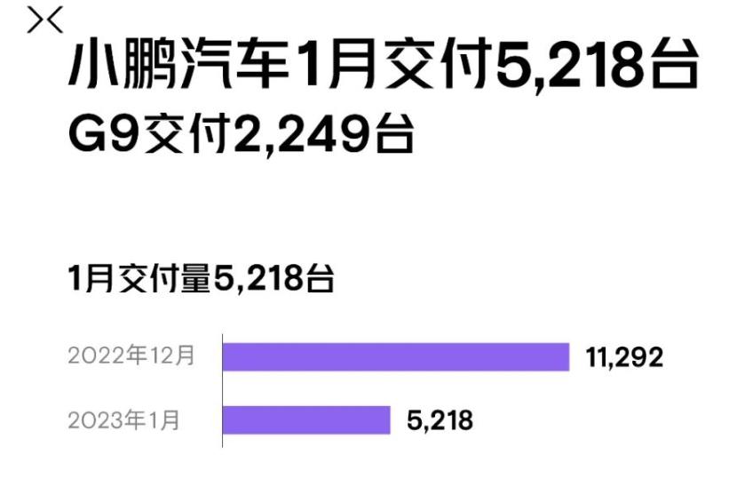 数据显示,1月份小鹏交付量为5218辆,较去年同期下降60%,环比上个月减少54%。值得一提的是,小鹏新车型G9在1月份卖出2249辆,占到总交付量的43%,成为小鹏交付水平的主要支撑。