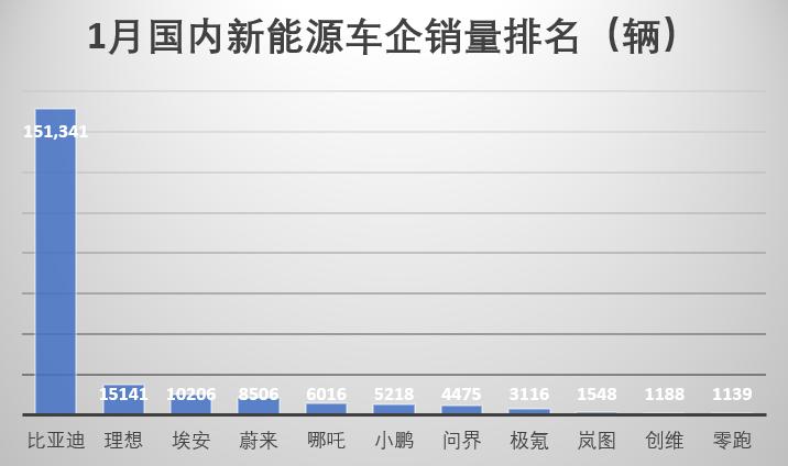 细数目前已经公布销量数据的国内主流新能源车企,1月销量排名如下:
