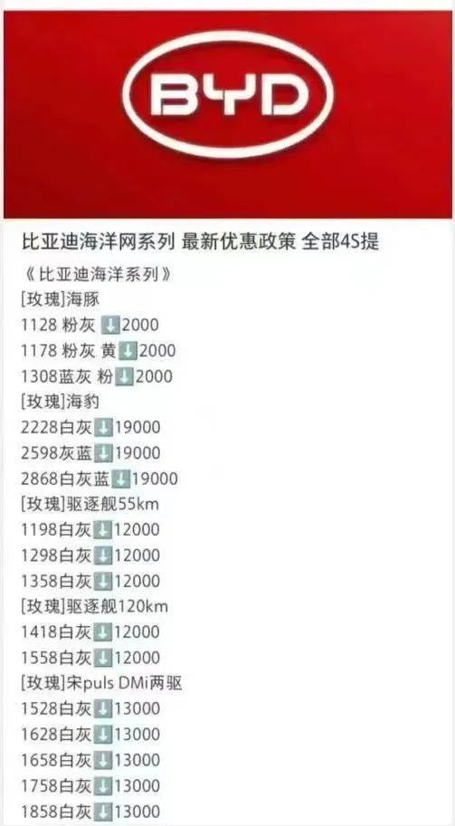 比亚迪官方虽然没有宣布降价,但有消息传出,比亚迪销售体系的二级供应商,也有降价措施。涉及的车型包括比亚迪海洋系列以及王朝系列的宋。