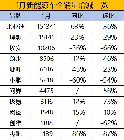 根据已经公布1月份数据的车企表现来看,除比亚迪和理想汽车实现同比两位数增长外,其他车企包括埃安、蔚来、哪吒、AITO、极氪等品牌均有所下滑,其中零跑汽车下滑幅度最高,环比跌幅达到87%,直接跌出销量前十。