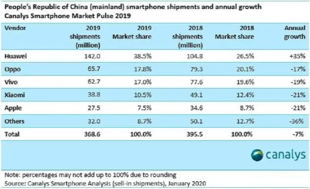 2019年,中国智能手机市场出货量高达3.69亿台,其中华为市场份额高达38.5%,第二至第五名分别为oppo、vivo、小米、苹果,魅族销量仅500万台。同年,魅族再次裁员30%。