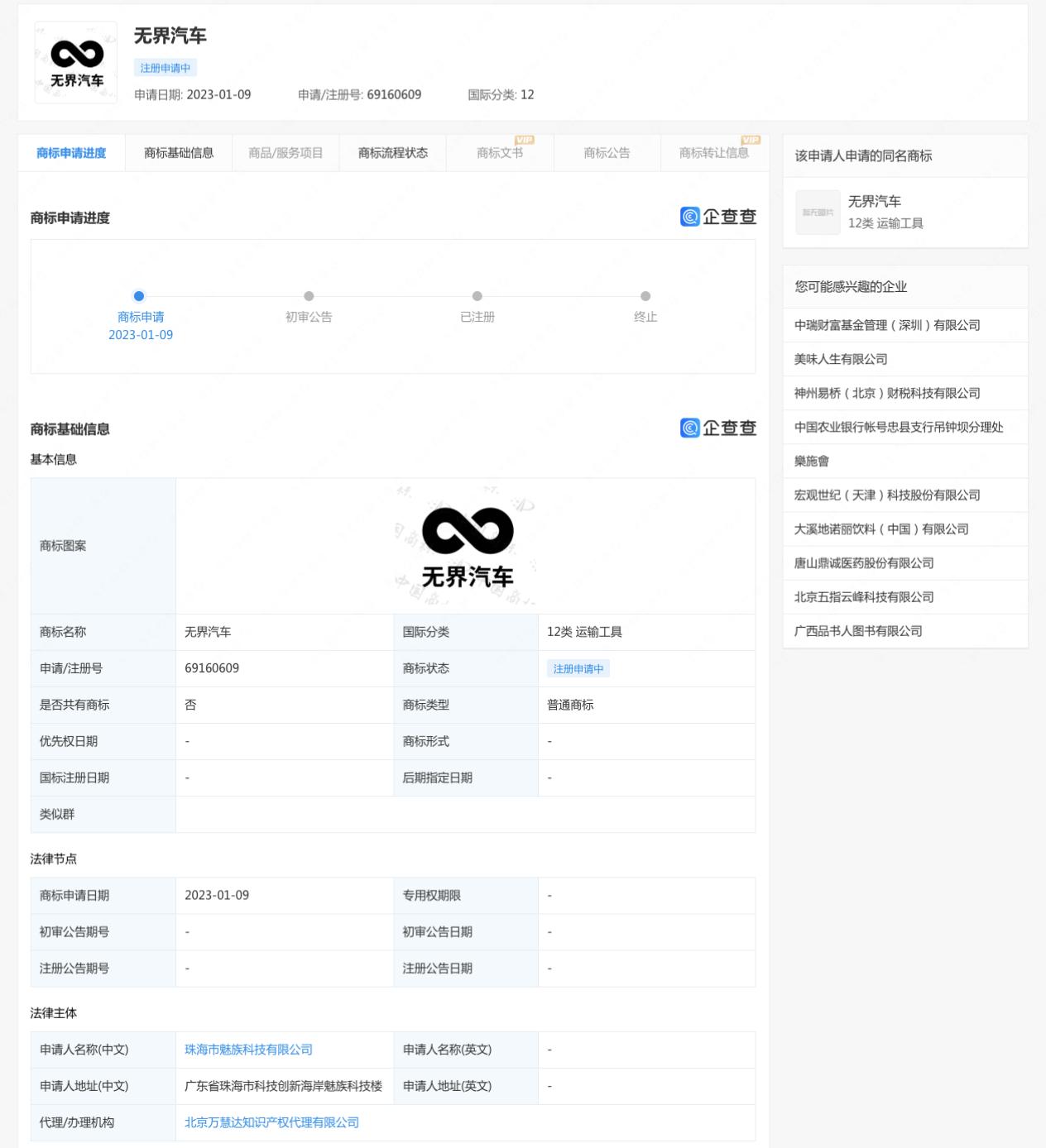 2023年1月,有消息爆料称魅族正在申请注册“无界汽车”的商标,从国际分类来看为运输工具,商标状态为申请中。商标的形状类似莫比乌斯环,也像是数学中的“无限符号”。