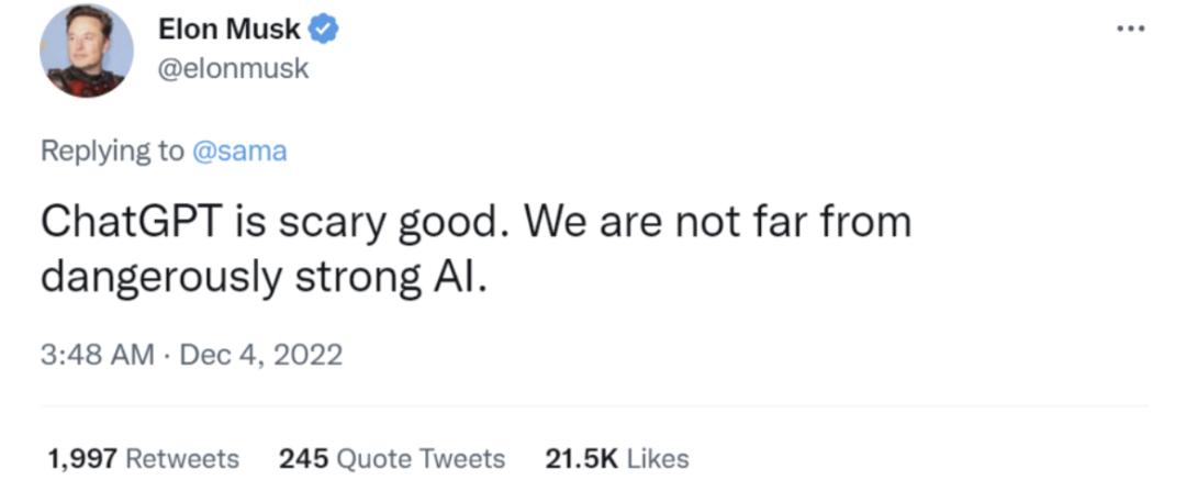 ChatGPT推出的那一天,Twitter上有个叫josh的用户马上就说:“谷歌完蛋了。”马斯克也在几天后发推称,ChatGPT好的惊人,我们离强的可怕的AI不远了。