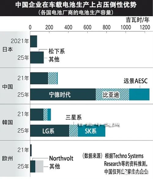 宁德时代的德国工厂(该公司提供)在生产扩大的速度方面,中国也更胜一筹。调查公司Techno Systems Research(TSR)2022年底推测,中国三大企业的电池产量截至2025年将达到每年1249吉瓦时,与同时期日本企业总和之差将由2021年的3.7倍扩大到8倍以上。