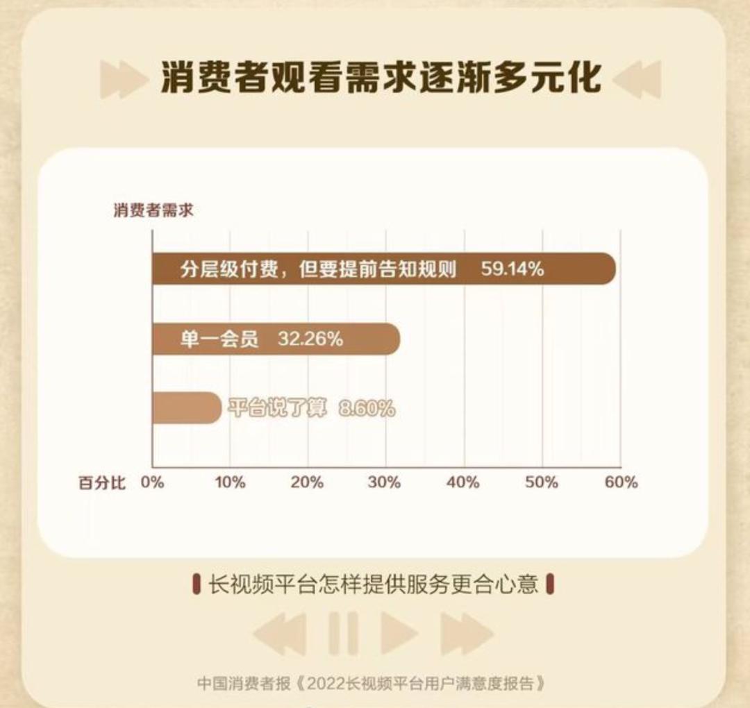 根据《2022长视频平台用户满意度报告》显示,超过70%的消费者愿意为优质视频内容付费,近60%的用户愿意分层级付费,但希望平台能够提前告知规则。