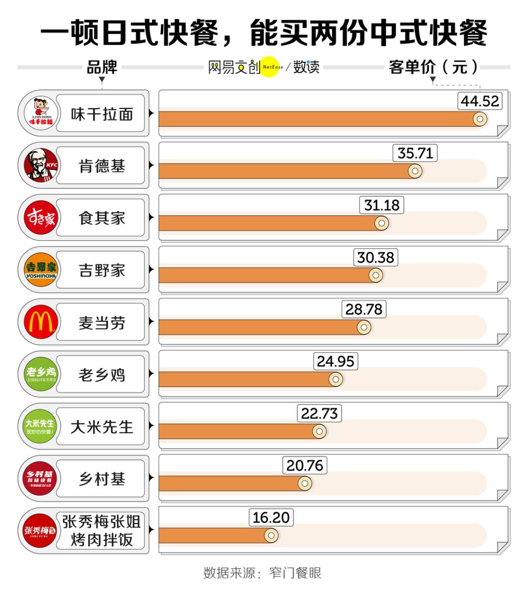 同样以米饭、面条为主食的中式快餐主打低价,客单价普遍在 25 元以内。相比动辄 30 元一份的吉野家牛肉饭,40 元一份的味千拉面,相同的价格可以在老乡鸡吃上好几个菜。