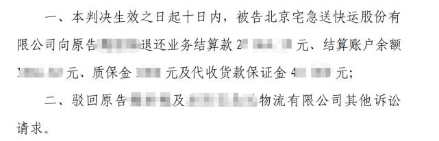 在王慧多方维权、讨要损失无果后,2022年下半年,她向法院起诉了宅急送公司,要求赔偿未提现的业务结算款、缴纳的贷款保证金、单方面终止合作导致的经营损失共9万多元。根据王慧提供的法院判决书,最终法院判决宅急送赔偿王慧拖欠的各类账款,驳回了其他经营损失诉求。