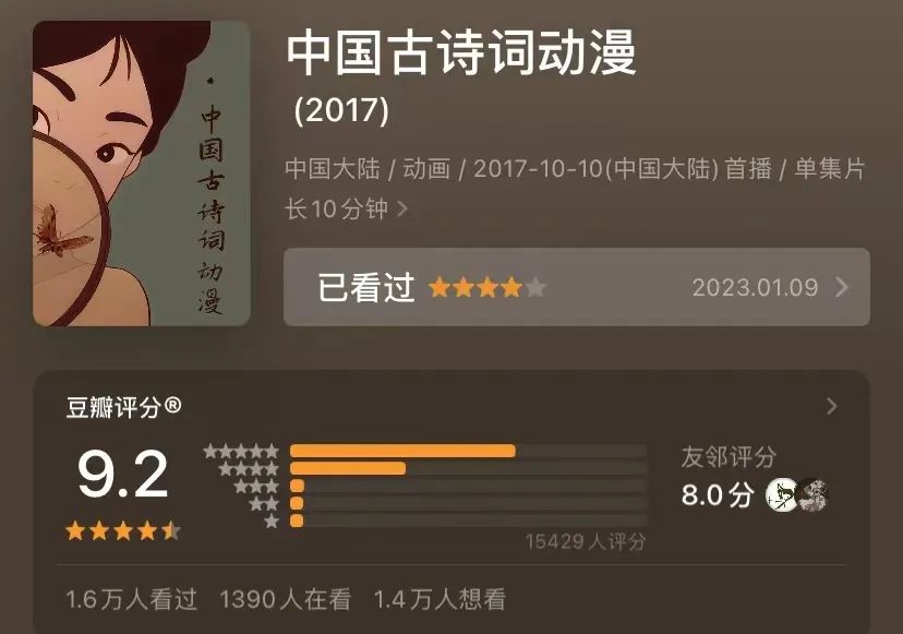 实际上,近年来国产动画一直不缺优质的短片,各大美术院校的毕业作品也时常会有惊艳之作。在《中国奇谭》之前,由嘉定区委宣传部投资出品的《中国古典诗词动漫》豆瓣评分就高达9.2分。《中国奇谭》是蓄势已久的国产动画短片的一次彻底出圈,意味着在短片领域,国产动画在技术层面早已不输国外,水墨、剪纸、黏土、定格等风格也已经百花齐放,然而却未能实现从动画短片到动画长片的惊险一跃。一旦涉及到完整宏大世界观的构建,神话传说的重新演绎,种种问题就会暴露无疑,毕竟仅靠绚丽画风、古典意境很难让观众撑到最后。