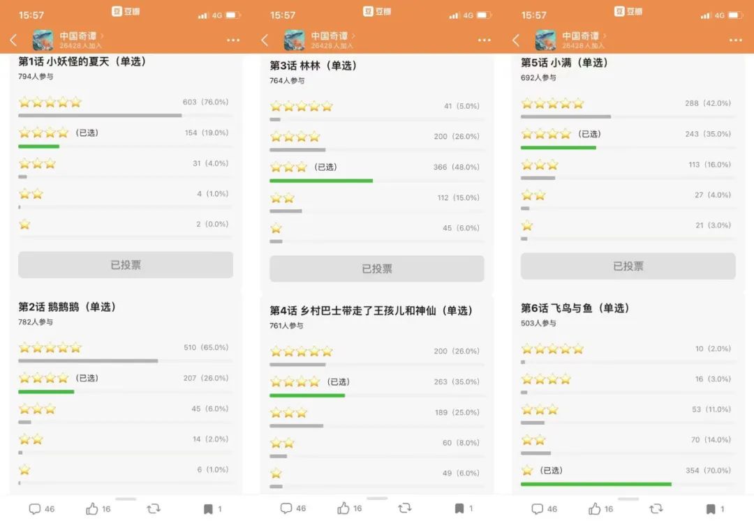 由于前两集之后口碑开始出现分化,豆瓣《中国奇谭》小组不断有人建议不同单集分开打分。很快就有组员发起分集评分投票,虽然目前只有700多人参与,但足以反映出追番粉丝们的鲜明好恶。第一、第二集分别有76%、65%的人给出了五星,第三集《林林》则有50%的人打了三星,第四集《乡村巴士带走了王孩儿和神仙》有40%给出了三星以下评分,第五集《小满》口碑回升,四星五星占到了77%,第六集《飞鸟与鱼》则是断崖式崩塌,70%的人给出了一星。