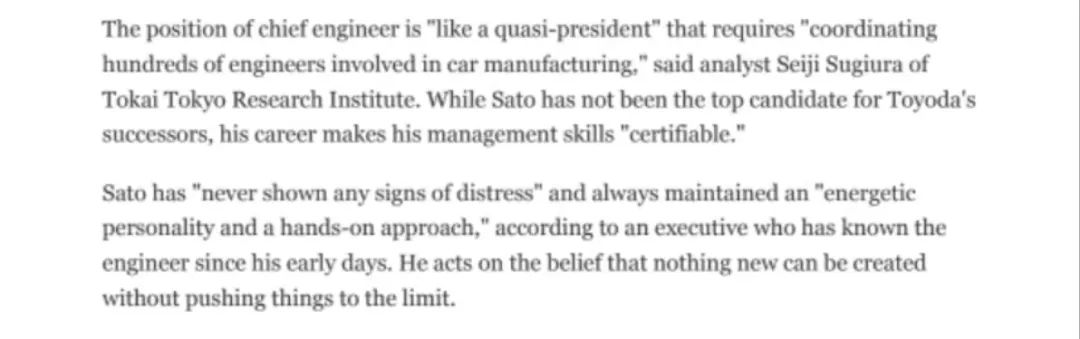 与出身文科的丰田章男不同,佐藤恒治是技术人员出身,可以贯彻丰田一直坚持的现场管理模式——可以亲自到现场与工程师交流探讨。并且在担任雷克萨斯总工程师的时候积累了丰富的管理经验,Tokai Tokyo Research Institute 的分析师Seiji Sugiura 表示:“总工程师的职位就像一个准总裁,需要协调数百名参与汽车制造的工程师。他的职业生涯让他的管理技能有目共睹”