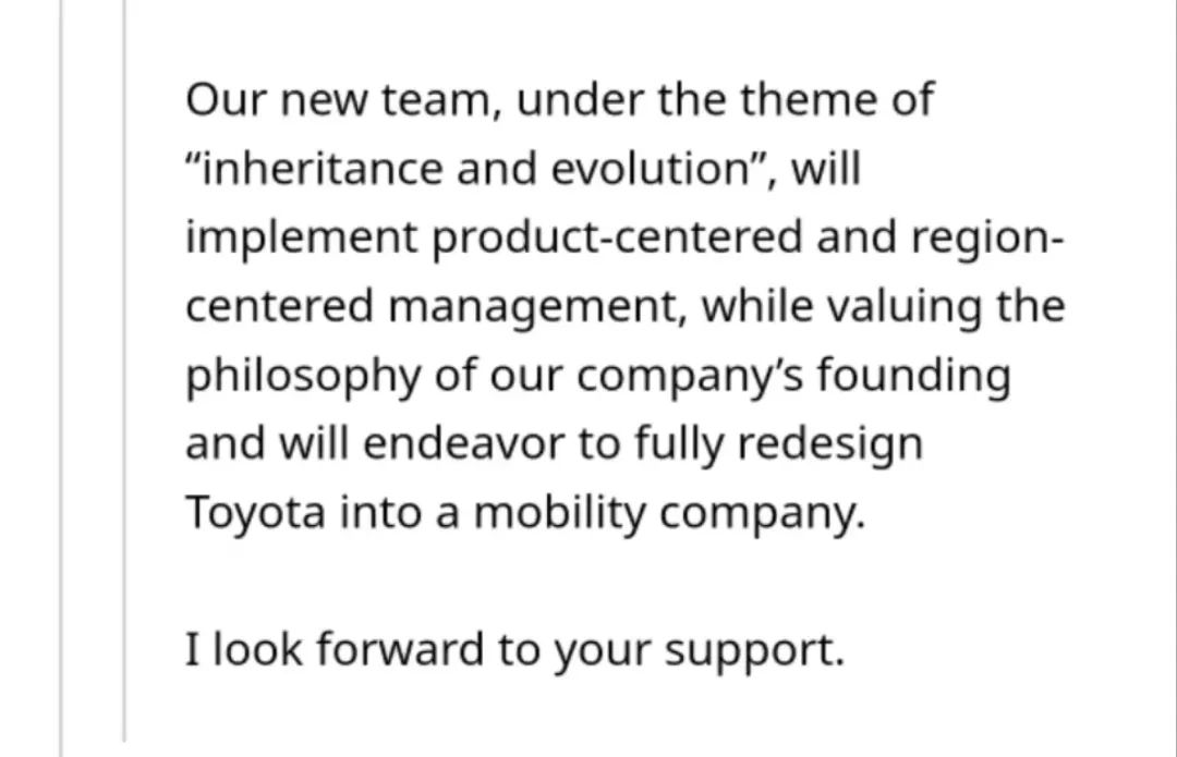 在1月26日的宣布社长更换的直播上,佐藤恒治发表了闭幕词:“新团队的使命是在保持丰田核心价值的前提下,将丰田转变为一家移动公司。”