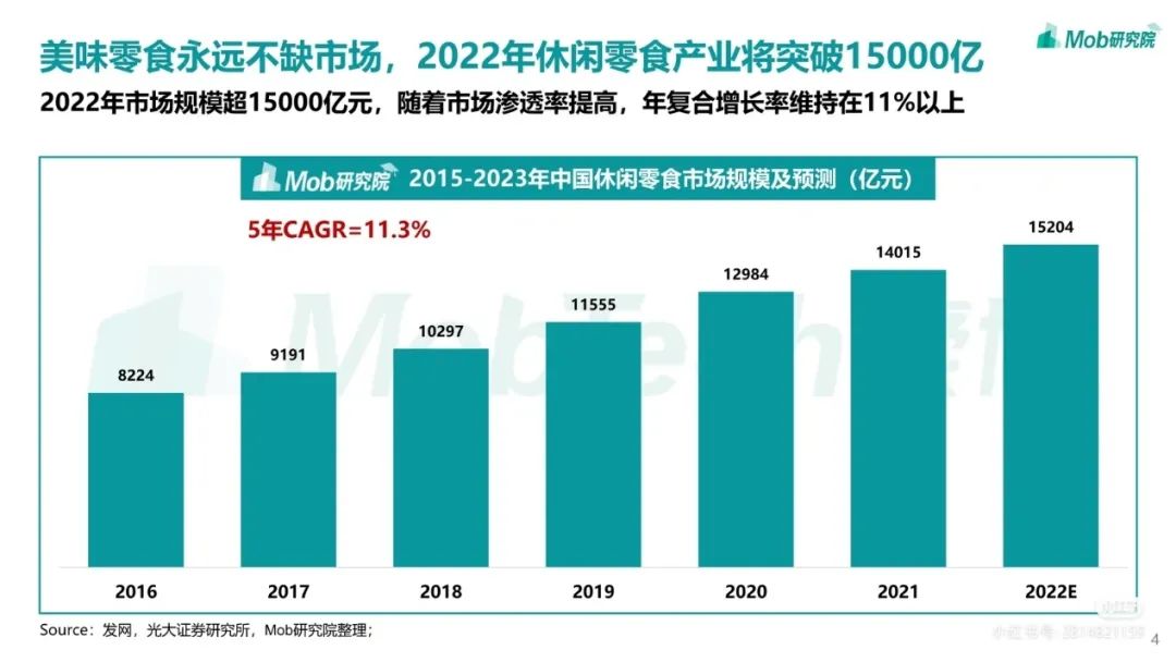 据数据显示,2016—2021年中国休闲食品行业市场规模从8224亿元提升至14015亿元,年复合增长率约11%以上,2022年市场规模赶超15000亿元。
