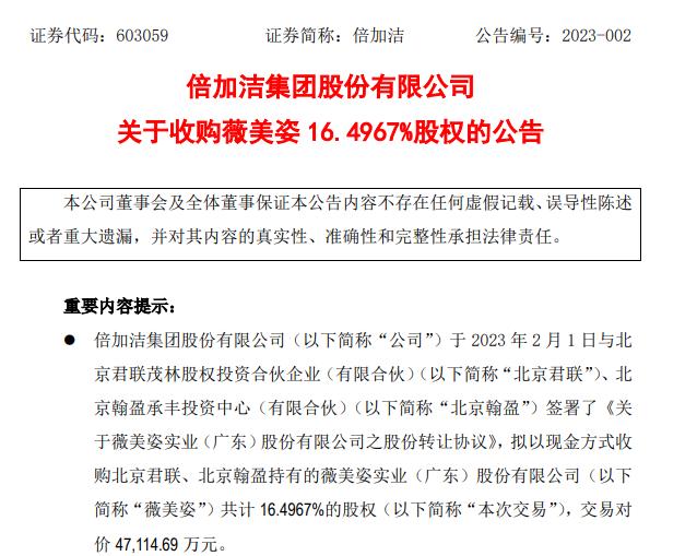 昨日(2月2日),口腔护理产品代工厂倍加洁集团股份有限公司(下称倍加洁)宣布拟收购薇美姿实业(广东)股份有限公司(下称薇美姿)16.4967%的股权,交易对价4.71亿元,创下2023年开年日化行业第一大收购案。