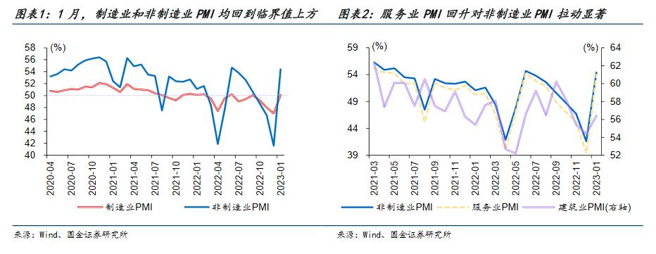 从主要经济指标看,首先是1月制造业采购经理指数(PMI)为50.1%,高于上月3.1个百分点,为2020年3月以来最大环比升幅;非制造业PMI和综合PMI产出指数分别为54.4%、52.9%,高于上月12.8和10.3个百分点。