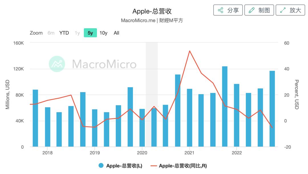 据财报,2022年10月至12月的一个季度,苹果公司营收1172亿美元,同比下滑5%,归母净利润300亿美元,同比下滑13%。其倚重的大中华区市场表现也不及预期,收入239亿美元,同比跌了7%。