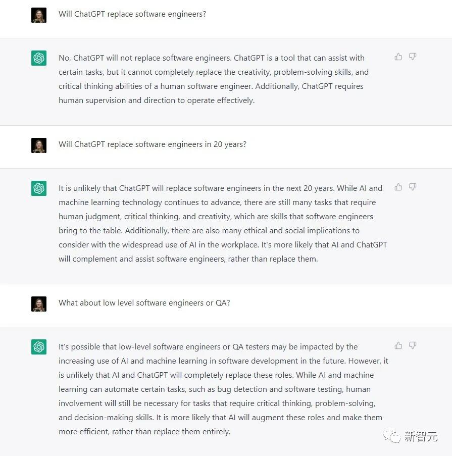 有人问ChatGPT,它是否会取代人类软件工程师,ChatGPT表示:「不,ChatGPT不会取代软件工程师」。