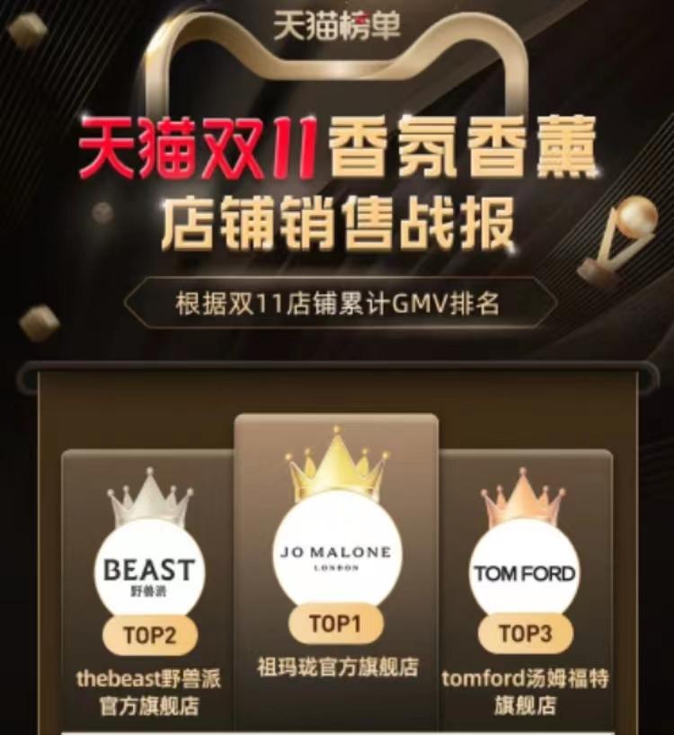 值得一提的是,在天猫公布的2022年香水香氛店铺双11销售战报中,祖玛珑和TOM FORD汤姆福特分别位列第一名、第三名。