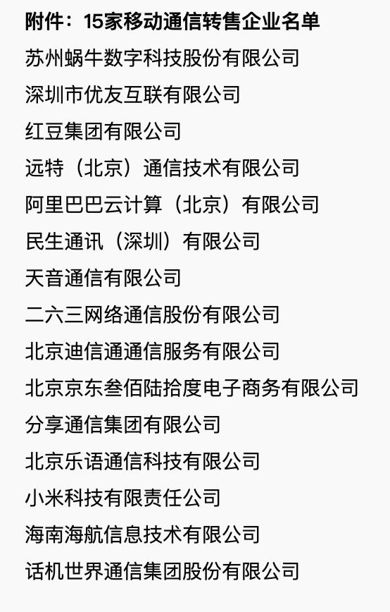 2013年年底,工信部向11家企业颁发了移动通信转售业务运营试点牌照,它们虚商业务的品牌名称分别为天音移动、连连科技、乐语通信、华翔联信、京东通信、北纬蜂巢互联、阿里通信、信通通、分享通信、中麦通信、话机世界。2014年,又有30余家企业获得了试点牌照,其中包括小米、中兴、苏宁等知名公司,国内虚拟运营商的数量超过了40家。