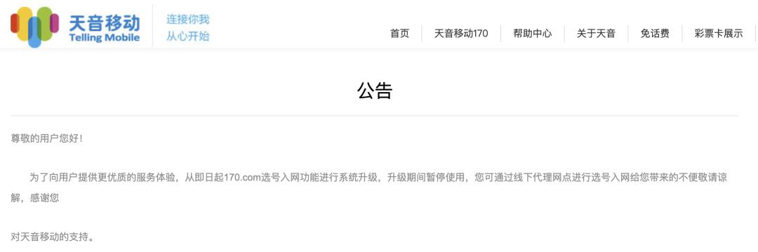 像京东通信的官网还能正常访问,但已经无法选号办卡,甚至商品详情页也点不开;而阿里通信官方旗舰店,只有一款号卡套餐在销售;天音通信官网显示还在系统升级,只能线下办理选号入网业务。