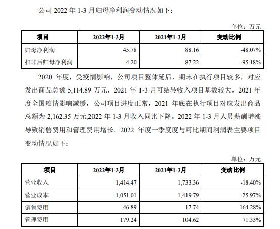 但在2022年上半年,中孚环境出现业绩暴涨暴跌。2022年第一季度,中孚环境实现营收1414.47万元,同比下降18.40%;归母净利润45.78万元,同比下降48.07%,扣非归母净利润4.2万元、同比下降95.18%。对此公司解释称,主要系疫情对公司业务产生影响,导致设备完工交付量不及预期。