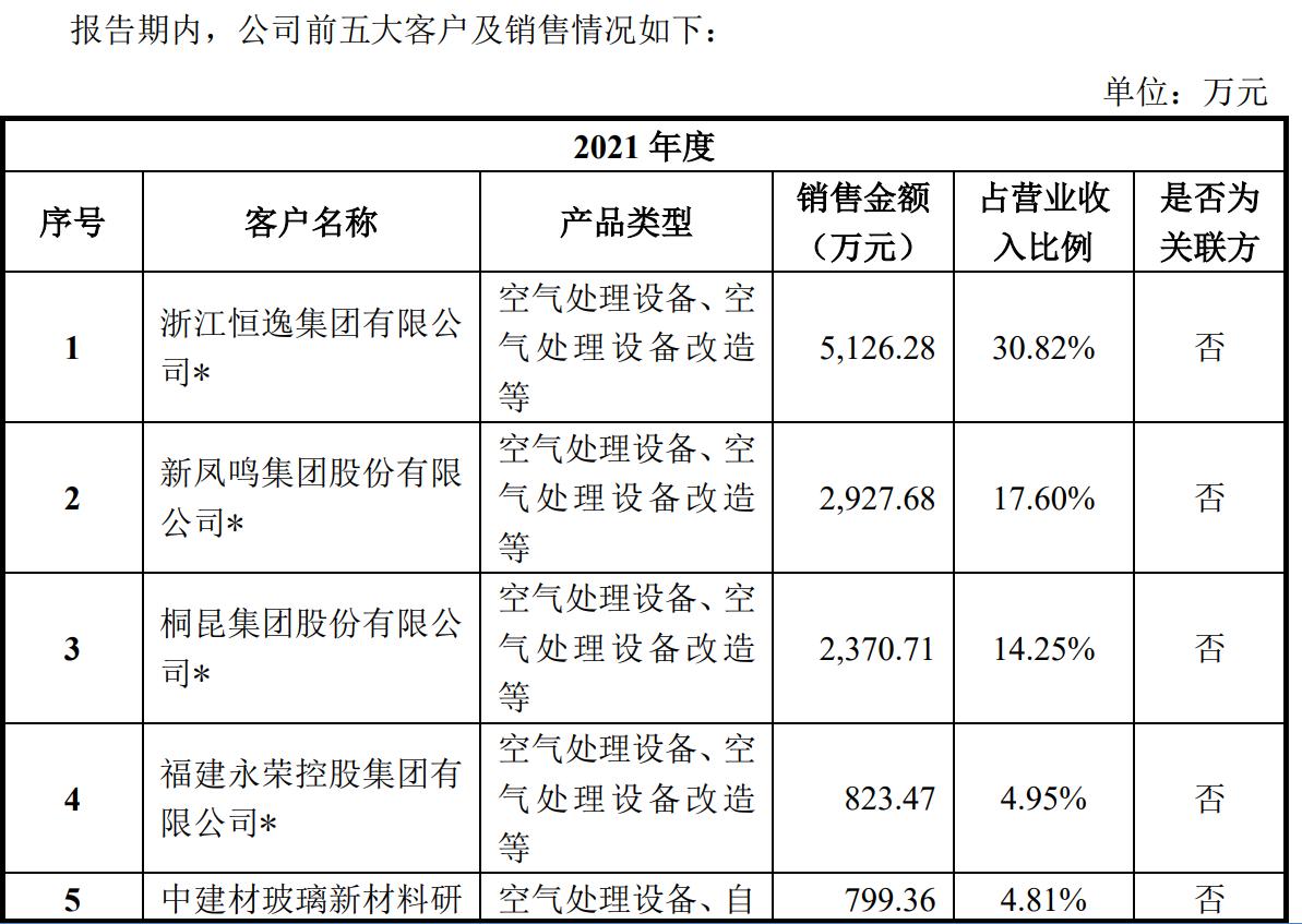 2019年~2021年,中孚环境对前五大客户的合计销售额占营收的比例分别为48.42%、79.66%和72.44%,而其中主要为化纤工业企业。