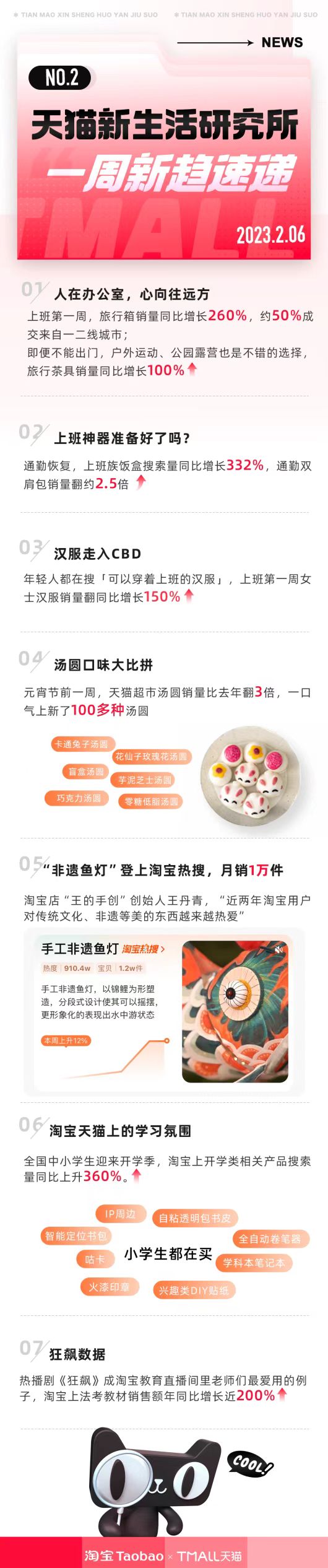 元宵节少不了吃汤圆、放花灯。节前一周,天猫超市一口气上新了100多种口味的汤圆,销量同比去年翻3倍。天猫上活跃着大量勇于尝鲜的年轻用户,他们在今年元宵节选择吃一种“很新的汤圆”,比如卡通兔子汤圆、盲盒汤圆、花仙子玫瑰花汤圆、芋泥芝士汤圆、巧克力汤圆、零糖低脂汤圆等。