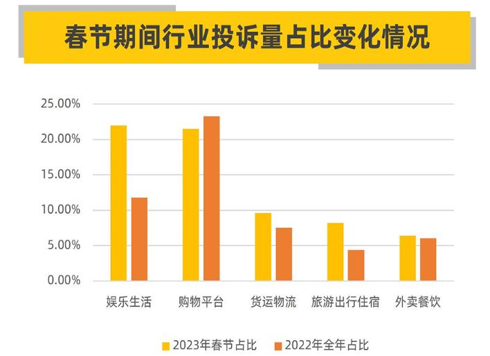 黑猫投诉最近发布《2023春节消费投诉数据报告》显示,与2022年全年数据相比,黑猫平台2023年春节期间娱乐、旅游出行相关投诉占比明显提升,这与今年春节整体消费市场,尤其是线下消费复苏呈现高度相关。