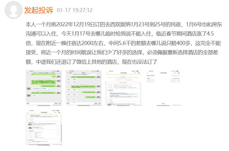 锌刻度在“黑猫投诉”搜索发现,有消费者投诉称,“本人一个月前2022年12月19日订的去西双版纳1月23号到25号的民宿,1月6号也和房东沟通可以入住,今天1月17号去哪儿临时给我说不能入住,临近春节期间酒店涨了四五倍,现在附近一晚住宿达2000左右,中间五六千的差额去哪儿说只赔400多,这完全不能接受,将近一个月的时间耽误让我们少了好多的选择。”
