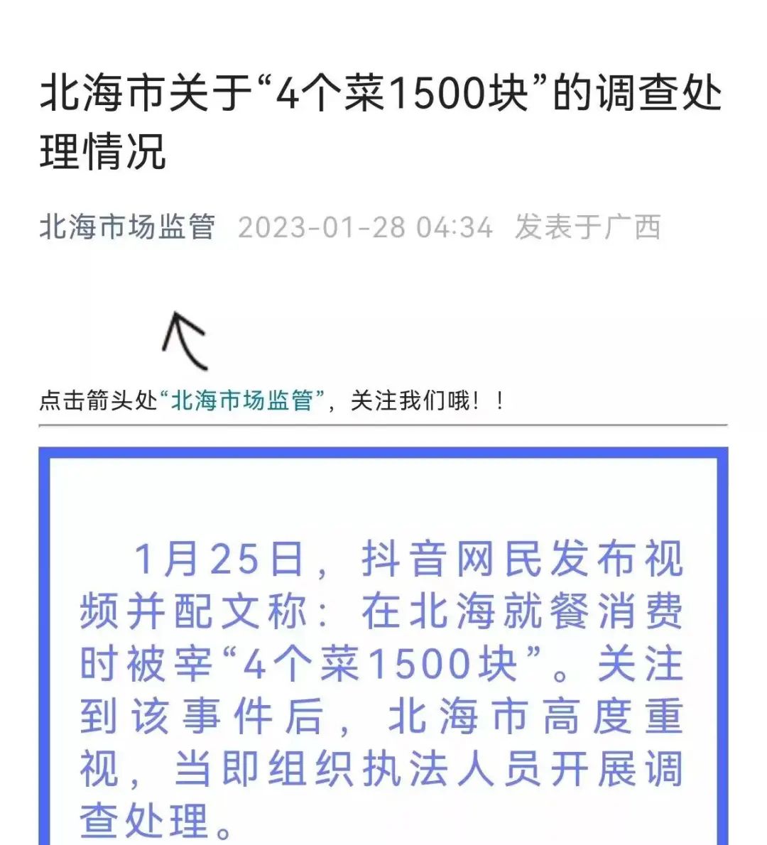 另有网友在短视频平台发布视频并配文称,“在北海就餐消费时被宰,4个菜1500块”,北海市场监管官方公众号发布了调查处理情况称,“经调查,该店家存在支付出租车司机回扣招揽客人、未与消费者充分沟通即匆忙配菜下单、部分海鲜经烹饪后分量略少等问题。北海市市场监管局等相关部门已责令店家停业整顿、限时整改并立案处罚。”