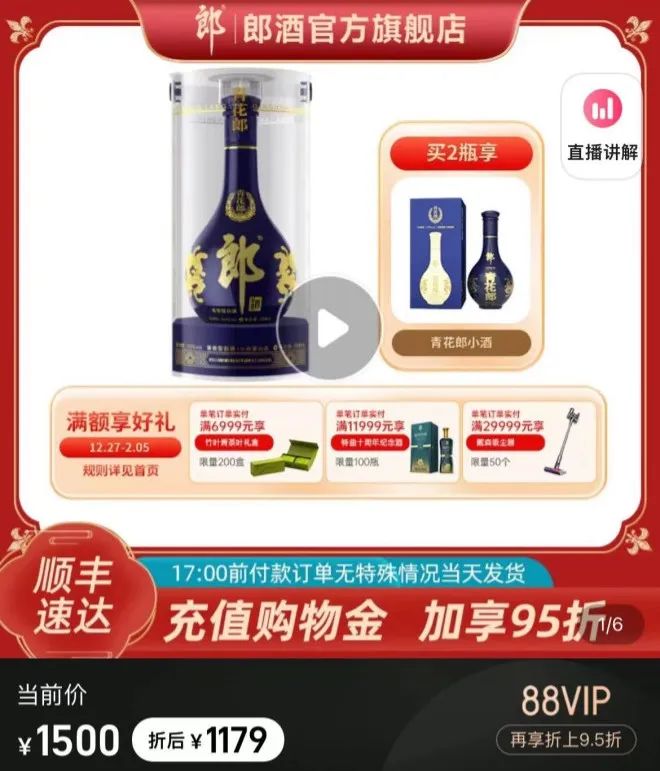 从零售端的表现来看,标价1500元/瓶的53度500毫升青花郎,在天猫官方旗舰店折后价为1179元/瓶,在京东和酒仙网折后也均未超过1200元/瓶。