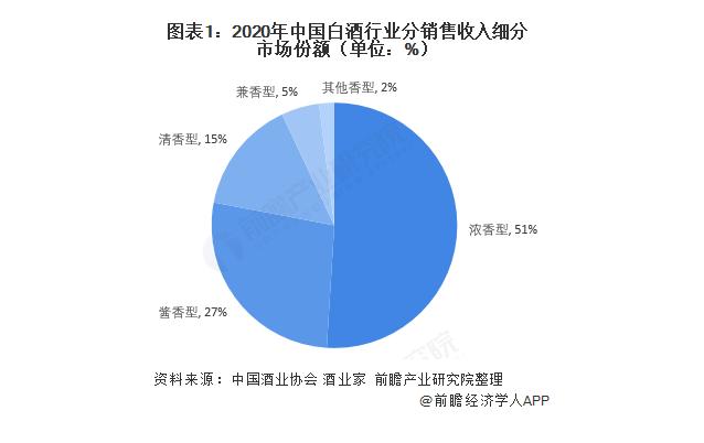 根据前瞻产业研究院数据显示,2020年,中国白酒行业分销售收入细分市场中,浓香型、酱香型、清香型以及兼香型的份额分别为51%、27%、15%以及5%。