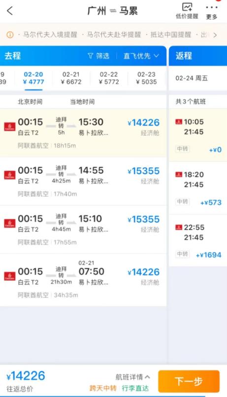 旅界查询携程发现,南航2月20日等多个广州-马尔代夫直飞已经改成迪拜转机航线,且价格均有不同程度大幅上涨,仅3月份直飞马尔代夫的航班尚可正常预定。