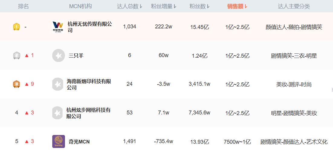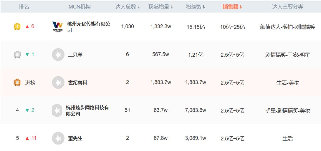 横向对比同时期的达人总数榜单和销售额榜单,尽管部分MCN公司拥有较多的达人,但其销售额数据并不突出。