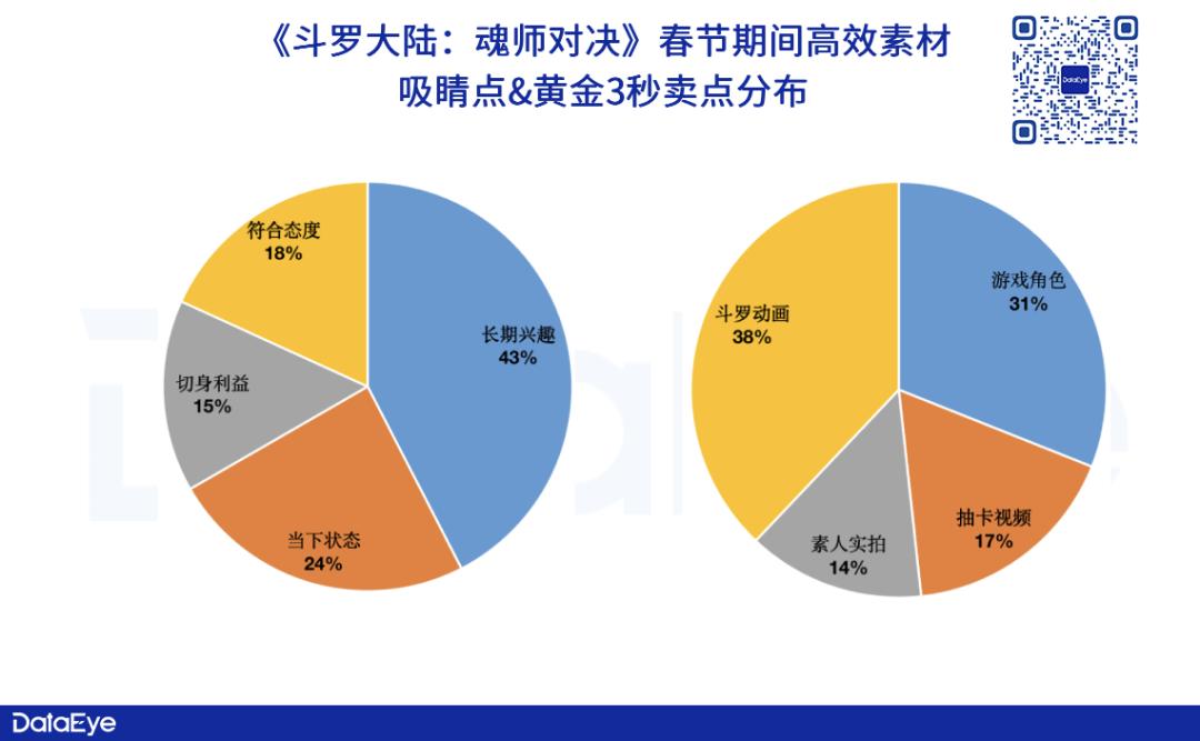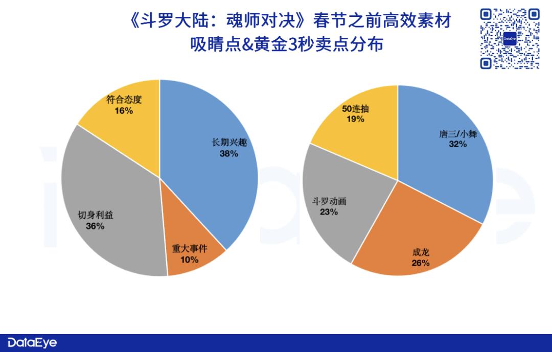 而到了春节期间,《斗罗大陆:魂师对决》素材的吸睛点及黄金3秒卖点整体与春节之前保持相同的节奏。但不同的是,《斗罗大陆:魂师对决》也会在素材之中增加诸如“新春福利”的词汇,期望以此增强在春节期间的曝光。