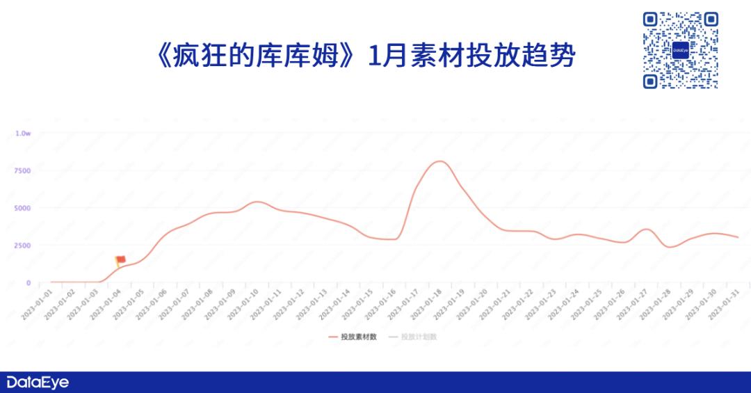 《疯狂的库库姆》于1月上旬正式上线,但其投放策略却并不像《自在西游》一般在上线当天进行大范围铺量,而是选择在春节档前夕进行集中投放,1月18日单日巅峰素材投放数同比1月16日增幅超182%。
