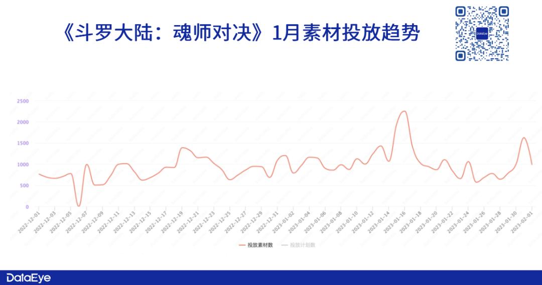 从投放趋势来看,《斗罗大陆:魂师对决》的投放策略是——日常保持一定量级的素材,用以维系产品在玩家圈层中的热度。而在春节档来临前(1月16日),素材投放量突然翻倍(同比1月14日),但后续却仅保持日常期望在短时间内提升产品的影响力和用户熟悉程度。