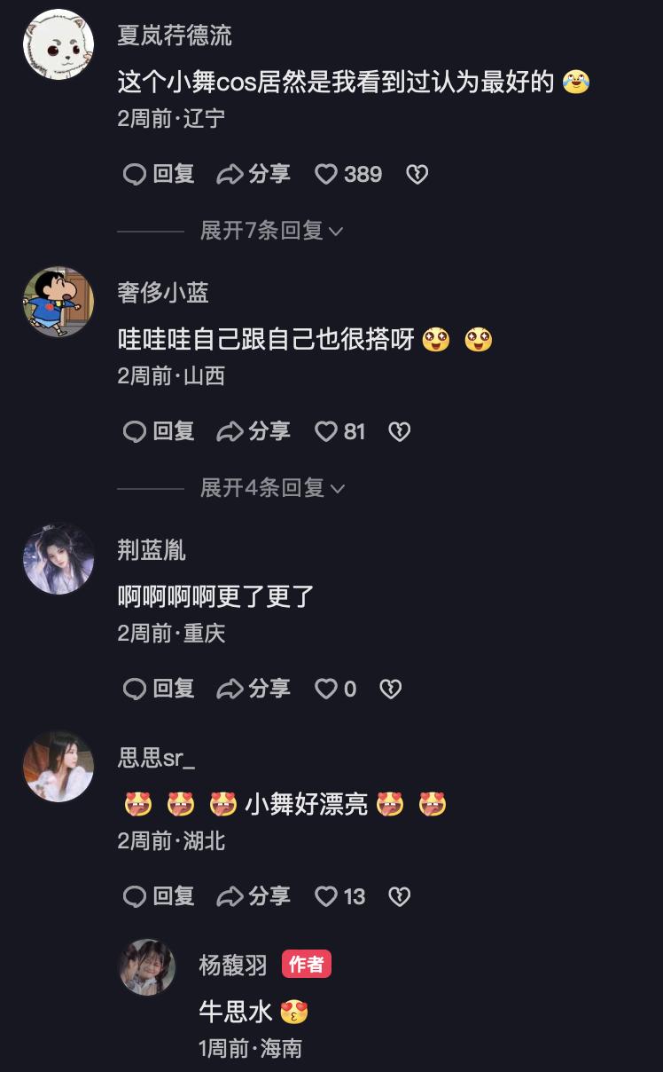 不及如此,杨馥羽还将改素材放到个人抖音账号上进行宣传,并且从评论来看,玩家也对杨馥羽的Cos还原度表示满意,这或许有利于提升素材对IP粉丝的吸引力。