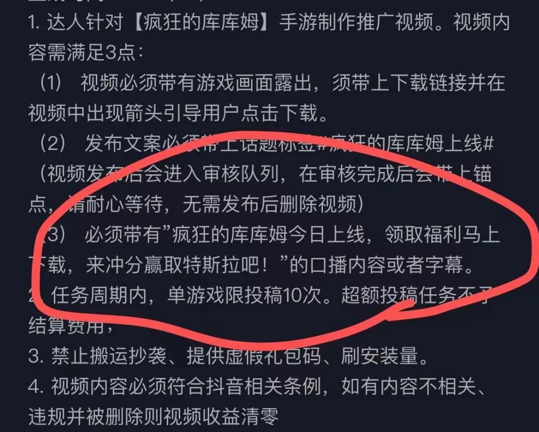 但另一方面,DataEye研究发现,《疯狂的库库姆》在游戏上线之初就开启了【玩游戏,送特斯拉】的福利活动(排名第一的玩家可以获得官方赠送的特斯拉轿车一部),并在“星图x发行人计划中”要求达人必须带有该活动的口播内容或字幕。