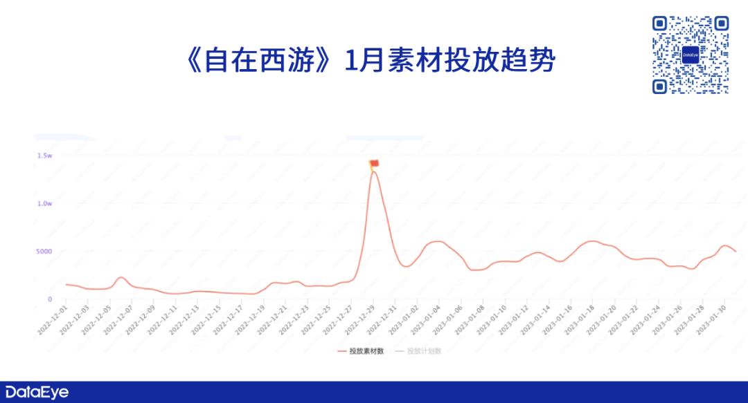 从投放趋势来看,《自在西游》在素材投放量表现上可谓相当强势。无论在测试、预热还是上线爆发,都展现了强劲的素材投入决心。而在春节档期间,《自在西游》单日素材投放量超3000组,并在春节来临前夕迎来一波投放小高峰。